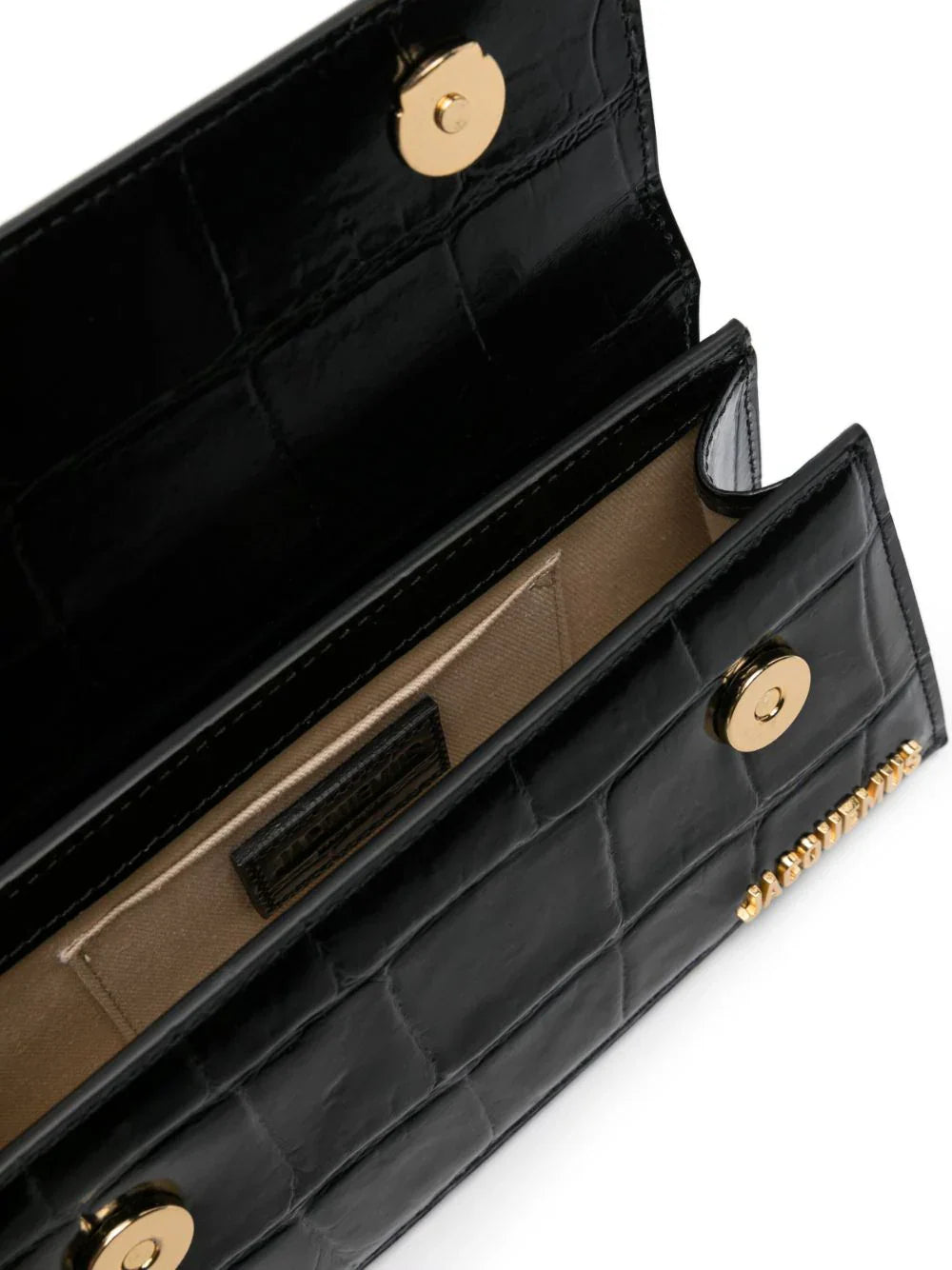 Debuted in AW19, the Chiquito bag has become an iconic Jacquemus symbol. Seen here in an elongated version, the silhouette is presented in a black crocodile-embossed construction and accented with a gold-tone lettering logo.